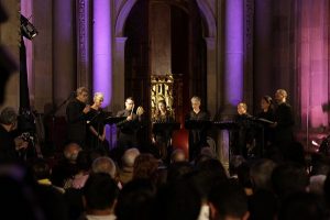 Ante un lleno total, la brillante polifonía de voces cautivó al público asistente llevándolo a través de distintos siglos de música, abarcando un periodo que comprende del siglo XIII al XV.