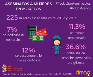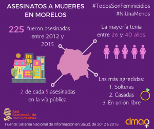 En Morelos, del 2012 al 2015 el mayor número de homicidios ocurrió en lugares públicos, donde fueron asesinadas principalmente mujeres jóvenes. En el caso de mujeres adultas, la mayoría han sido asesinadas en sus hogares, en este estado donde las organizaciones civiles denuncian una total ausencia de justicia para las víctimas y sus familias.